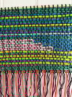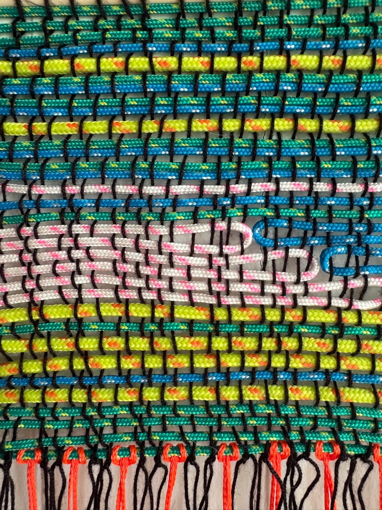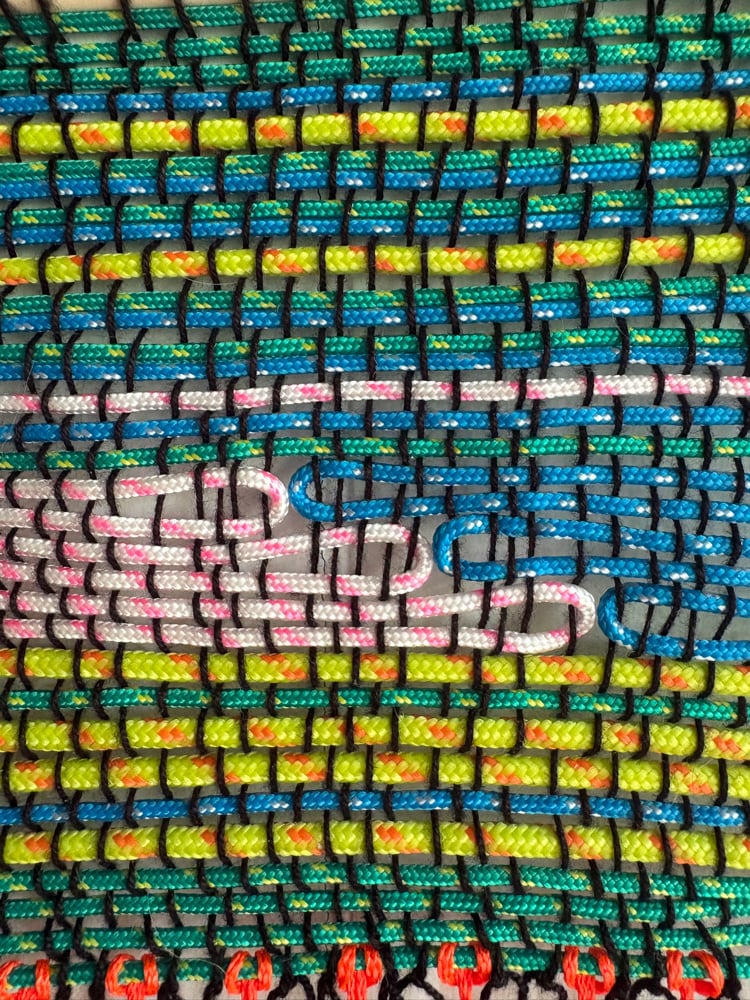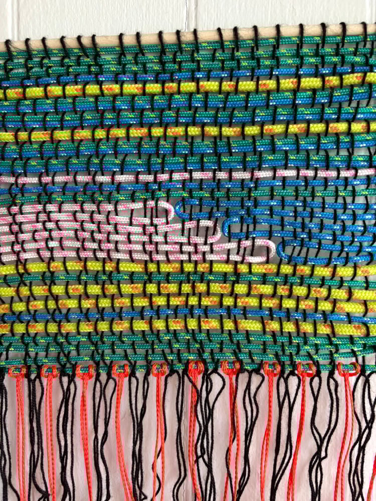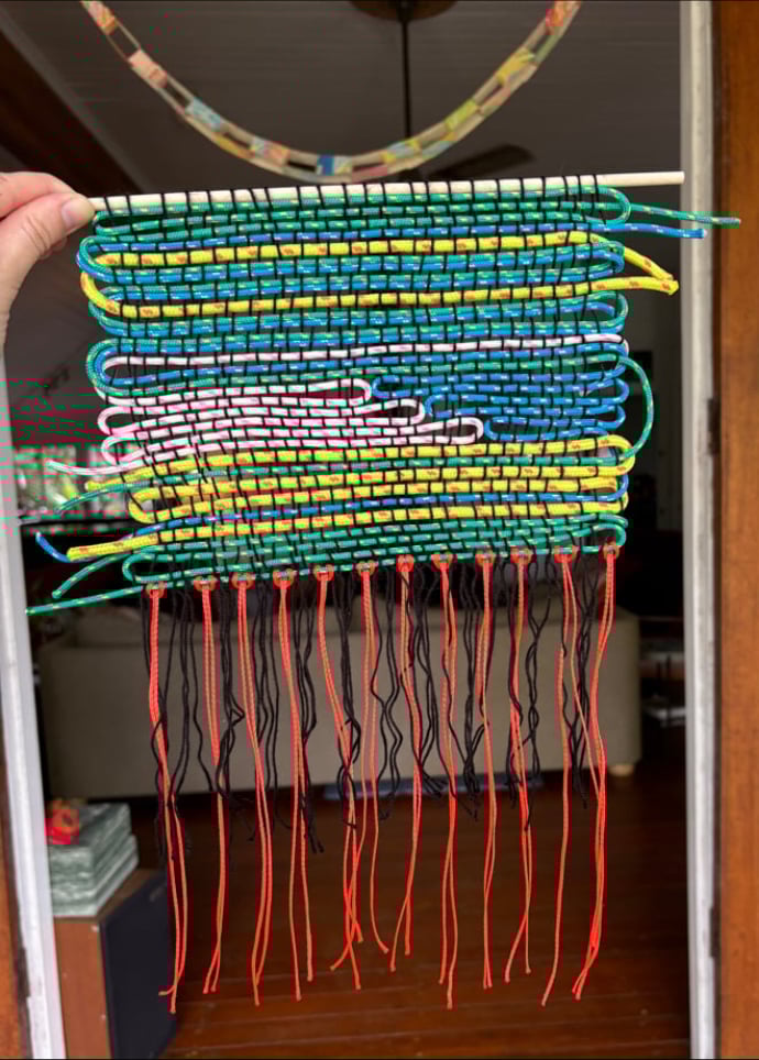 Handmade weaving, made from utility cord and paracord. medium size (hand for scale) - dimensions are approx. 25cm wide x16cm long (excludes tassles on bottom).